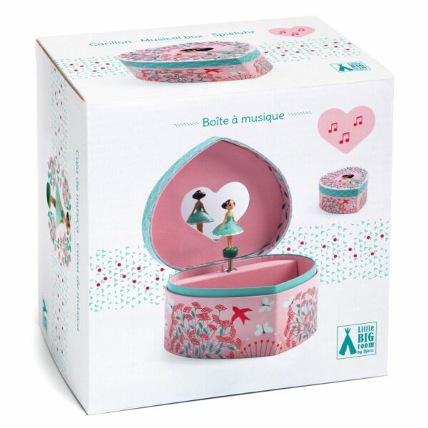 DJECO Mūzikas lādīte Pavasara melodija (DJ06089) ir eleganta rotu lādīte sirds formā ar greznu samta apdari. Atverot lādīti, skan Kārļa Marijas fon Vēbera melodija “Ielūgums uz deju” (aptuveni 2,5 minūtes) un meitenes figūriņa griežas pa apli. Tā ir lieliski piemērotu aksesuāru uzglabāšanai un kalpo kā ideāla dekorācija. Brīdinājums: Nav piemērots bērniem līdz 3 gadu vecumam.