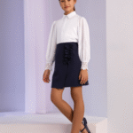 Skaista balta meiteņu blūze ar elegantu gipūras mežģīni priekšpusē un stilīgiem volāniem piedurknēs. Aizmugurē blūzei ir aizdare ar pogu, kas piešķir tai papildu šarmu un ērtību. Šī blūze ir ideāli piemērota skolas svinībām, dzimšanas dienām, ballītēm un citiem svarīgiem gadījumiem meitenes dzīvē, piedāvājot gan izsmalcinātību, gan komfortu.