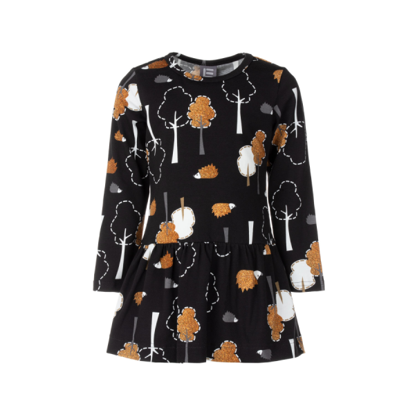 Meiteņu kleita no kokvilnas trikotāžas ar jauku apdruku ir lieliska izvēle ikdienas valkāšanai. Šī kleita apvieno komfortu un stilu, padarot to piemērotu dažādiem gadījumiem. Garās piedurknes nodrošina papildu siltumu vēsākām dienām, savukārt apakšdaļā esošais volāns ar apdrukātu audumu piešķir kleitai rotaļīgu un vieglu akcentu.