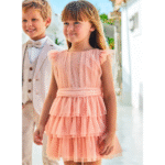 Skaista meiteņu kleita ar īsām piedurknēm ar volānu detaļām. Izgatavota no viegla un gaisīga tilla auduma. Ar stilīgiem dekoratīviem elementiem: tilla ziedu aplikācijām.