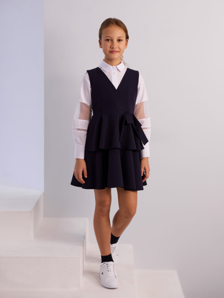 Melns sarafāns meitenēm, dizains ar elegantiem volāniem un skaistu sasienamu lentīti sānos. Šis sarafāns ir lieliska izvēle skolas svinībām, dzimšanas dienām un citiem svarīgiem mirkļiem meitenes dzīvē. Ar garumu, kas sniedzas virs ceļgaliem, šis sarafāns nodrošina gan izsmalcinātību, gan komfortu.