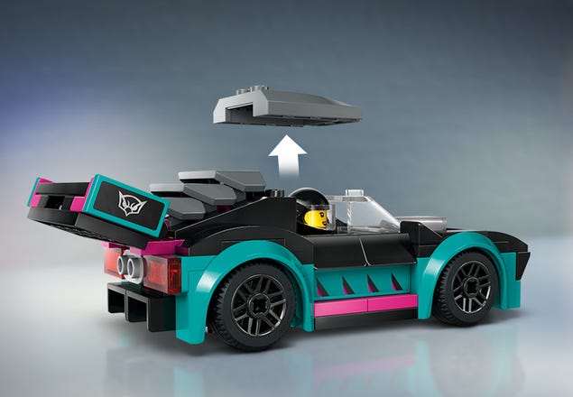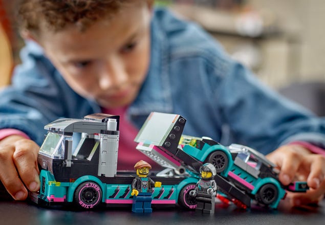 Iekļautas rotaļu kravas auto un sacīkšu auto vadītāja minifigūras.