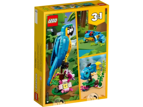 LEGO® Creator 3in1 komplekts “Eksotisks papagailis” (31136) ļauj bērniem no 7 gadu vecuma izbaudīt radošu būvēšanas prieku ar 253 detaļām. Viņi var uzbūvēt krāsainu papagaili ar pilnībā grozāmu ķermeni un kustīgiem spārniem/asti. Pēc tam modeli var pārbūvēt par rotaļīgu zivi vai šķelmīgu vardi ar kustīgām kājām. Lieliska balva vai dzimšanas dienas dāvana, kas rosina neierobežotas rotaļu iespējas.