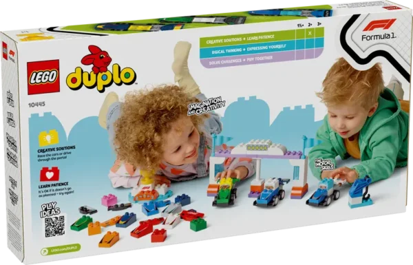 Iepriecini mazos F1® fanus ar LEGO® DUPLO® F1® Team Race Cars & Drivers (10445) — aizraujošu 70 detaļu komplektu pirmsskolas vecuma bērniem. Šis komplekts ļauj bērniem un vecākiem kopā atveidot aizraujošās Formula 1 sacīkstes, būvējot atpazīstamus elementus, piemēram, starta gaismas un goda pjedestālu.