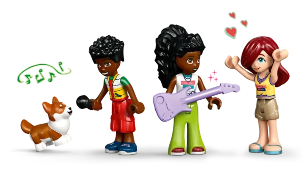 - Personāži: Komplektā iekļautas 3 LEGO Friends minilellītes (Peislija, Zaks un Elsa D) un mīlīga korgija figūra (Marimba).