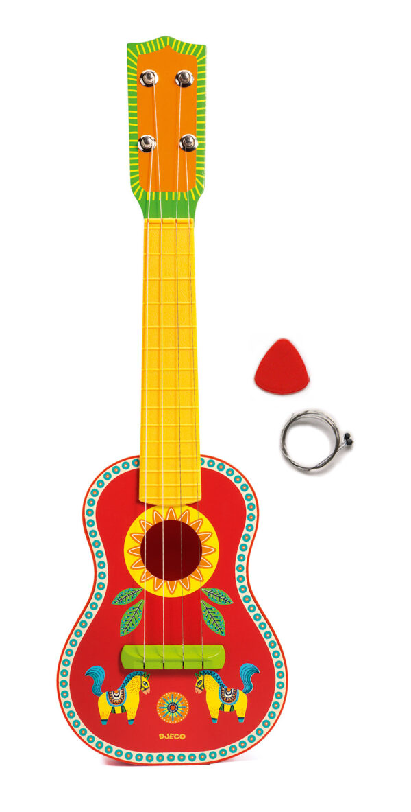 DJECO Animambo koka ukulele ir lieliska 4 stīgu ģitāra ar krāsainu dizainu, kas palīdz bērniem (no 3 gadiem) attīstīt pirkstu koordināciju, ritma izjūtu un muzikālo dzirdi. Komplektā iekļauts mediators, rezerves stīgas un pamācība skaņošanai. Tā ir droša un jautra iepazīšanās ar stīgu instrumentiem.