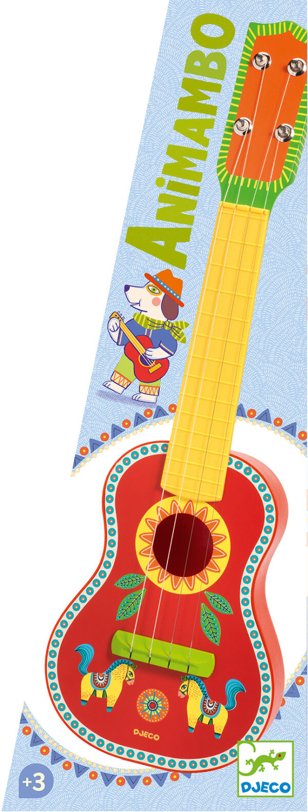 DJECO Animambo ukulele ir ideāls pirmais stīgu instruments mazajiem ģitāristiem (no 3 gadu vecuma). Šī nelielā ģitāra ar krāsainu dizainu un četrām stīgām sniedz bērnam iespēju gūt pirmo praktisko muzikālo pieredzi. Tā ir izcelsme no koka un plastmasas daļām, nodrošinot gan patīkamu skatu, gan izturību.