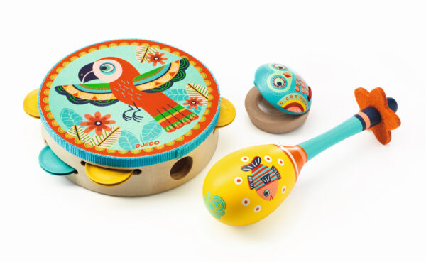 DJECO Animambo mūzikas instrumentu komplekts piedāvā trīs perkusijas instrumentus – tamburīnu, marakasu un kastaņeti. Visus instrumentus vieno krāsainais Animambo dizains un laba skaņa. Šis komplekts ir lieliski piemērots mazajiem muzikantiem, lai jau agrā bērnībā (no 3 gadiem) jautrā veidā attīstītu ritma izjūtu.