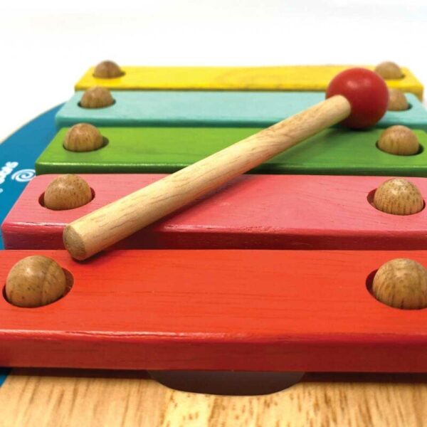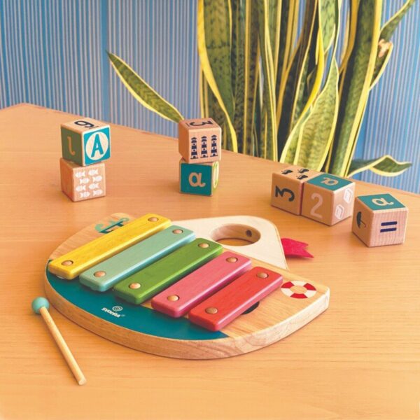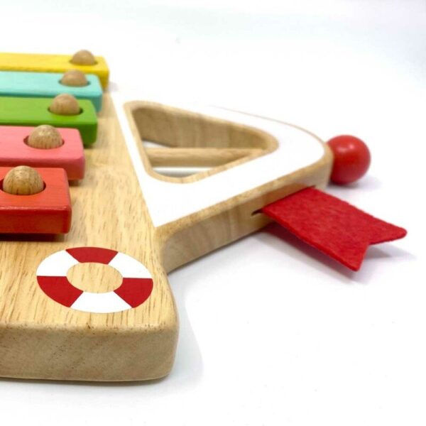 Ksilofons ir lielisks veids, kā iepazīstināt bērnus ar mūziku. Rotaļlieta veicina smalko motoriku un koordināciju, sitot pa toņiem. Inovatīvs risinājums: komplektā iekļautais sitamais kociņš ir ērti pievienojams ksilofona pamatnei, kalpojot kā laivas masts, tādējādi nodrošinot, ka tas nepazūd. Izmērs: 25 x 24.5 x 1.5 cm.