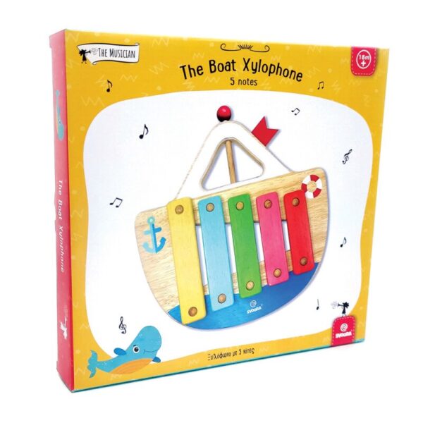 Svoora koka ksilofons, kas veidots jautrā laivas formā, piedāvā piecus krāsainus toņus. Tas ir ideāls pirmais solis mūzikas pasaulē bērniem no 18 mēnešu vecuma. Komplektā iekļauts sitamais kociņš, ko var ērti pievienot pamatnei kā laivas mastu, nodrošinot kārtību. Atbilst EN71 un ASTM drošības standartiem.
