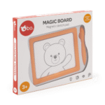 • Divpusēja funkcionalitāte: Viena puse ir paredzēta magnētiem ar cipariem, burtiem un dažādiem simboliem, kas ļauj bērnam mācīties skaitīt, lasīt un veidot savus pirmos vārdus. Otrā puse ir rakstāmā tāfele, kur bērns var zīmēt, rakstīt un izpaust savu radošumu.