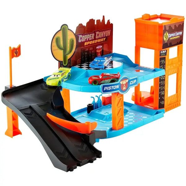 Šis unikālais rotaļu komplekts ir īsta paradīze visiem Cars faniem. Ar divstāvu garāžu, tumsā mirdzošiem elementiem un trim iecienītākajiem sacīkšu auto Zibeni Makvīnu, Kruzu Ramiresu un Ramonu – piedzīvojumi būs neaizmirstami.