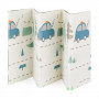 Paklājam ir divpusējs dizains ar rotaļīgām apdrukām, kas stimulē bērna interesi un redzes attīstību.