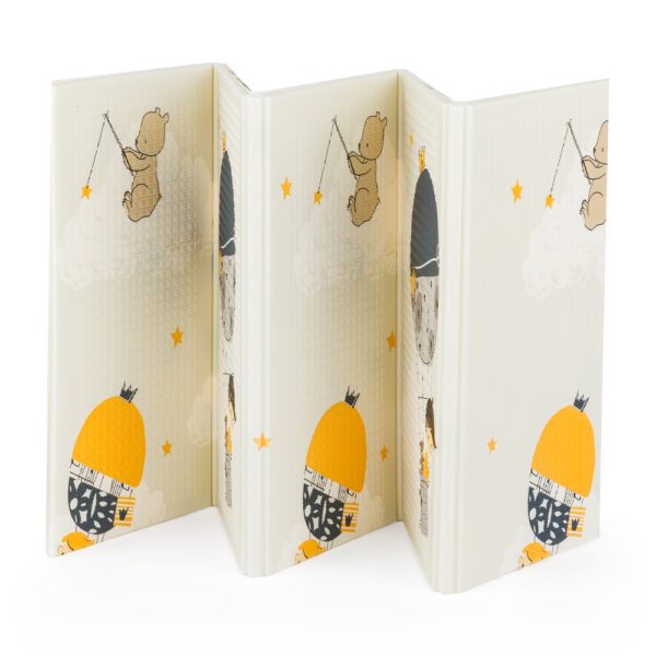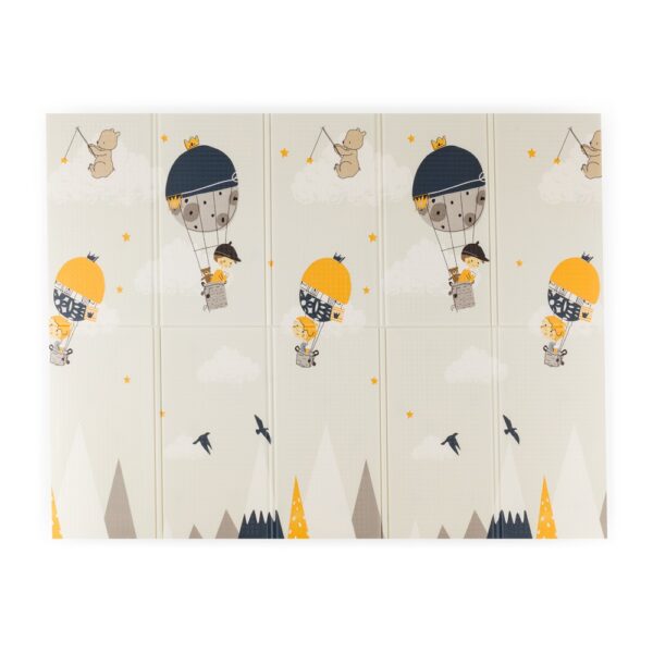 Paklājam ir divpusējs dizains ar rotaļīgām apdrukām, kas stimulē bērna interesi un redzes attīstību.