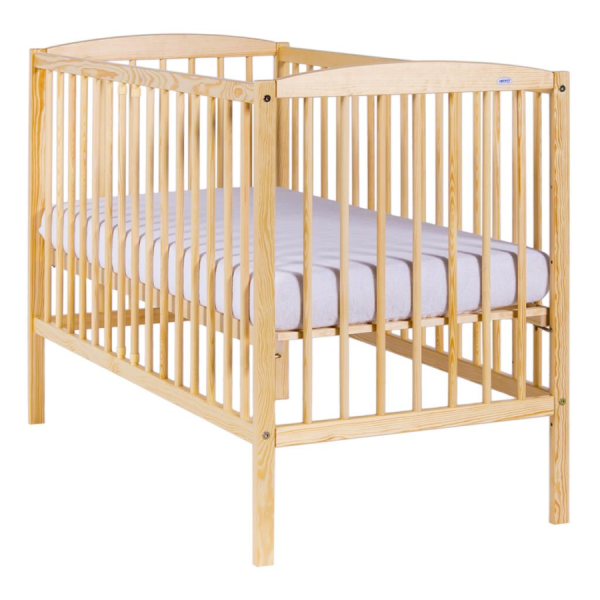 Skaista Drewex CLASICO gultiņa no priedes koka ar klasisku izliektu dizainu, ideāli piemērota mazuļiem.