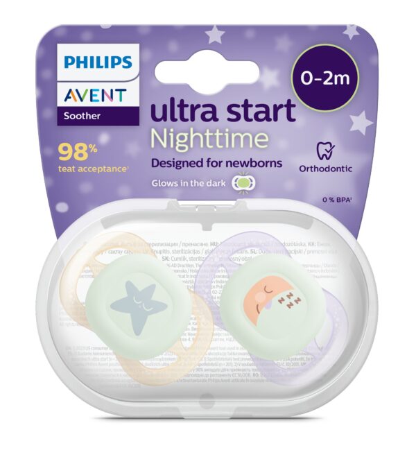Philips Avent Ultra Start Nighttime knupītis ir īpaši izstrādāts jaundzimušajiem (0–2 mēneši), lai nodrošinātu komfortu un mierinājumu jau no pirmās dienas. Mazs un viegls knupītis ir pielāgots mazuļa mutītei, veicinot ērtu lietošanu un optimālu saderību ar mazo sejiņu. Ortodontiskā, simetriskā silikona zīžamā daļa atbalsta pareizu sakodienu un mutes veselību.