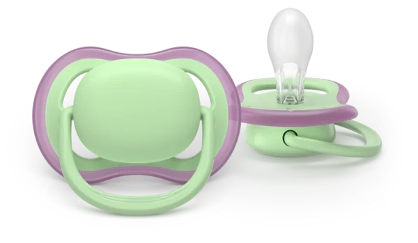 Philips Avent Ultra Air knupītis ar spīdīgu pogu tumsā nodrošina mazulim elpošanu, komfortu un dabisku sajūtu, ortodontisku silikona zīžamo daļu, 80% augu izcelsmes materiālu un ērtu sterilizēšanas/pārnēsāšanas futrāli.