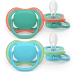 Philips Avent Ultra Air knupītis ar spīdīgu pogu tumsā nodrošina mazulim elpošanu, komfortu un dabisku sajūtu, ortodontisku silikona zīžamo daļu, 80% augu izcelsmes materiālu un ērtu sterilizēšanas/pārnēsāšanas futrāli.