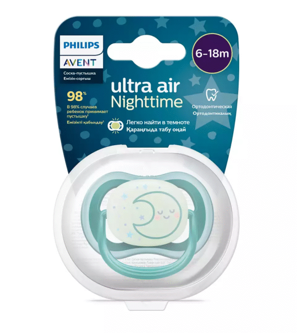 Philips Avent Ultra Air knupītis ar spīdīgu pogu tumsā nodrošina mazulim komfortu un sausu ādu ar lielajām gaisa atverēm. Knupītis ir ortodontisks, ar mīkstu, teksturētu 100% pārtikas kvalitātes silikona zīžamo daļu, kas nodrošina dabisku sajūtu un atbalsta mutes dobuma attīstību. Spīdīgā poga ļauj viegli atrast knupīti tumsā, neieslēdzot gaismu. Sterilizējams ceļojumu kastītē 3 minūtēs. Pieejams dažādās krāsās un dizainos, ražots Nīderlandē.