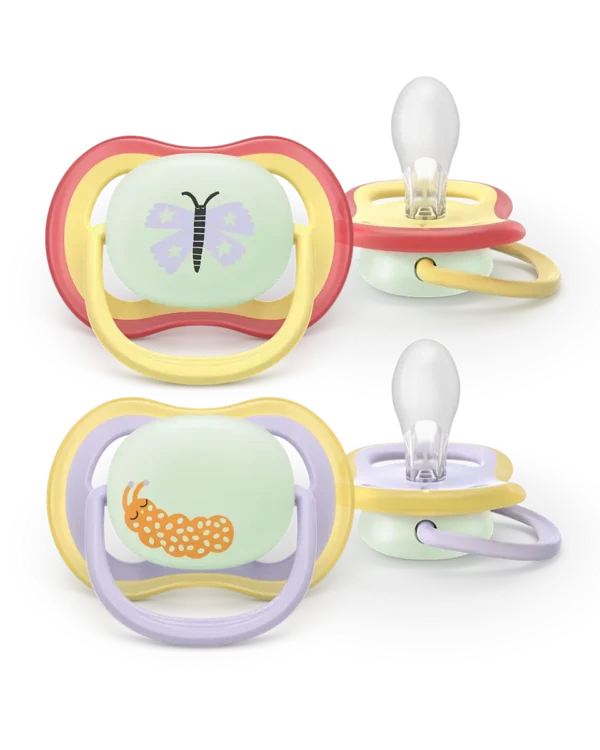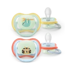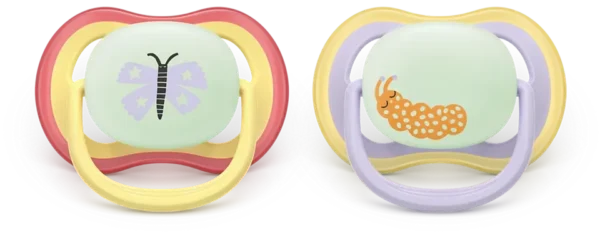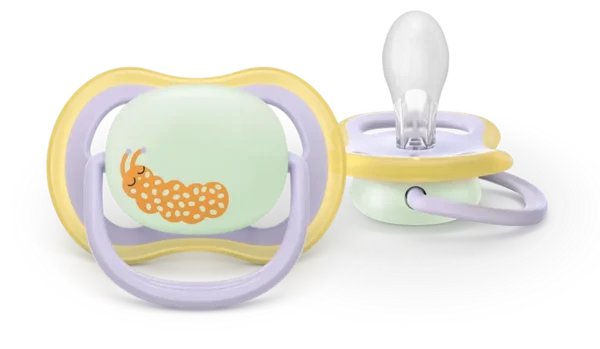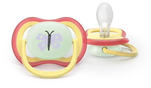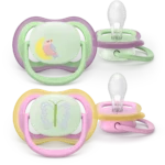Philips Avent Ultra Air Nighttime māneklītis (0–6 mēn.) ar lielām gaisa atverēm ļauj mazuļa ādai brīvi elpot, nodrošinot īpašu komfortu. Ortodontisks, mīksta silikona knupītis ar 98% pieņemamību un 80% augu izcelsmes materiāliem. Komplektā 2 gab., spīd tumsā un ērti sterilizējams futrālī.