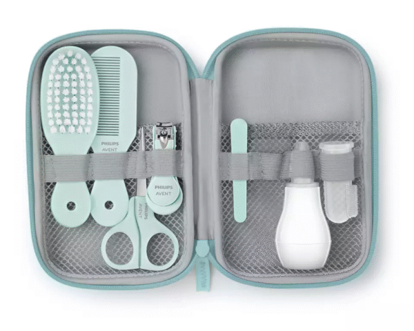Philips Avent SCH401 mazuļa aprūpes komplekts — kompaktā somiņā ietverts deguna aspirators, uz pirksta uzliekama zobu birste, nagu un matu kopšanas komplekts. Ideāls ceļojumiem un dāvanai.